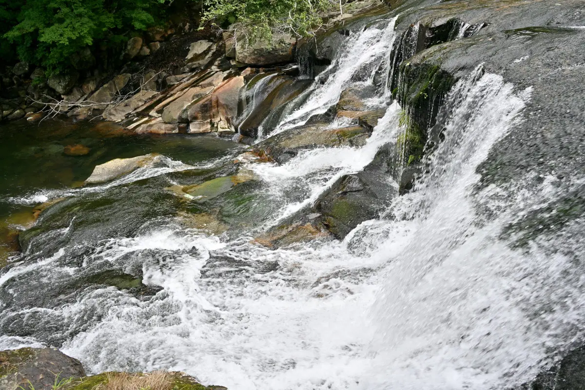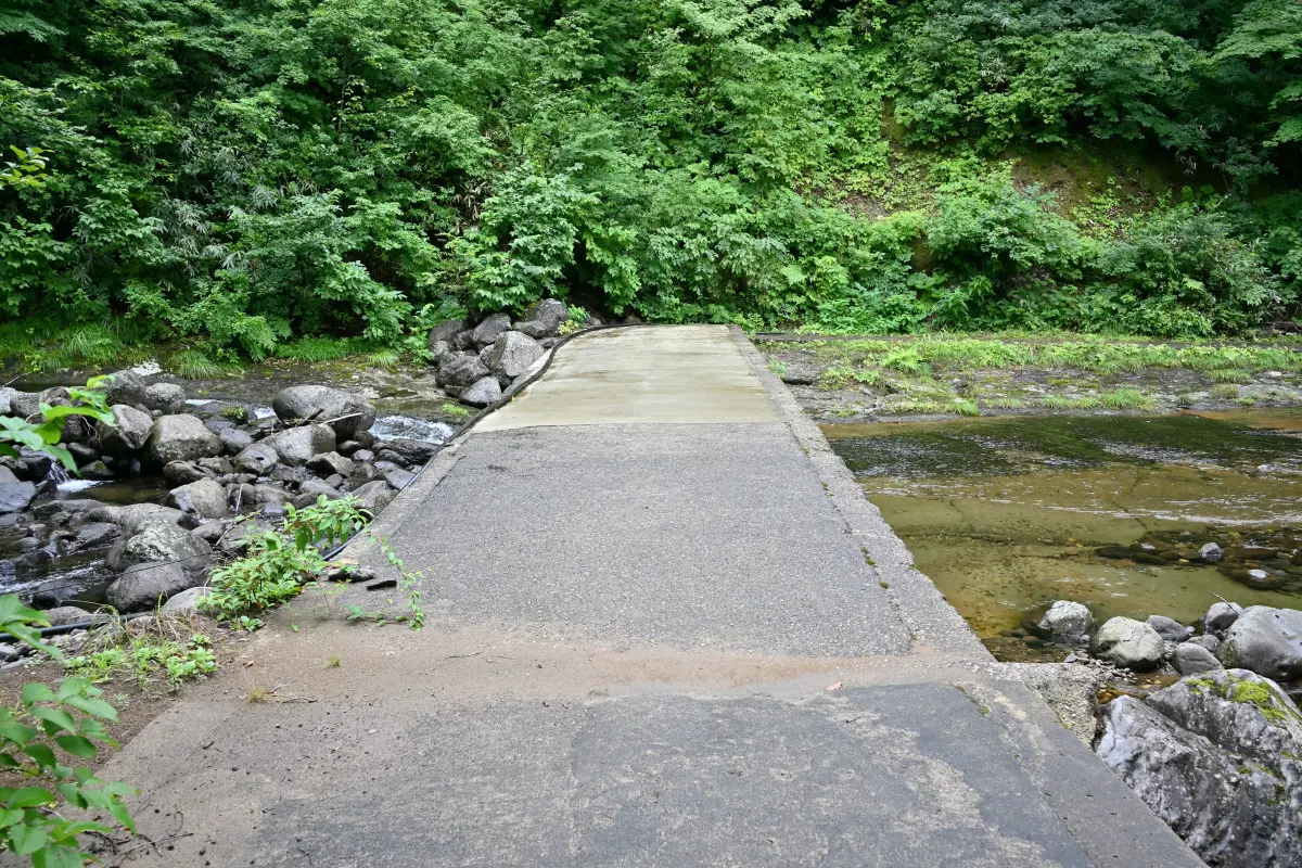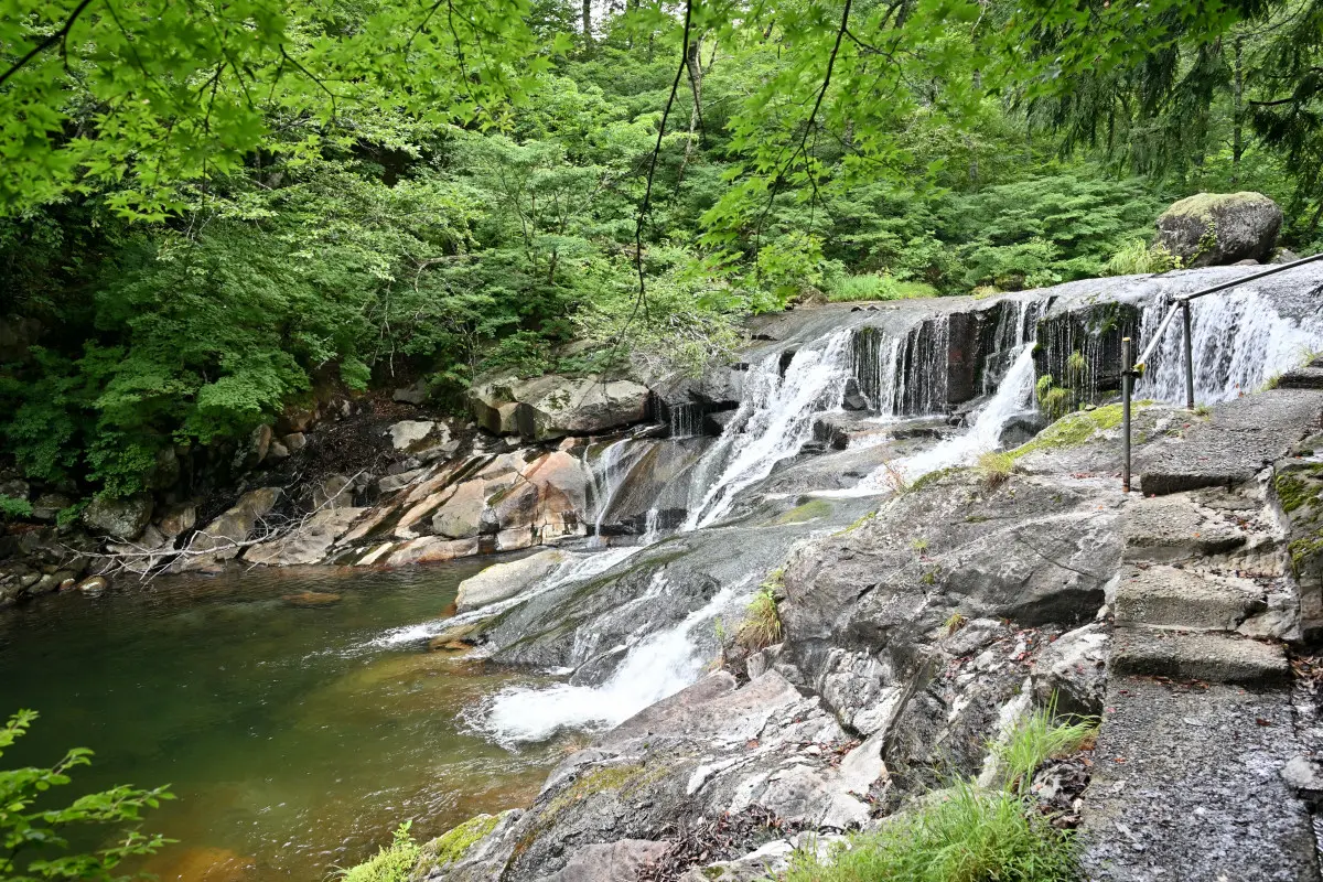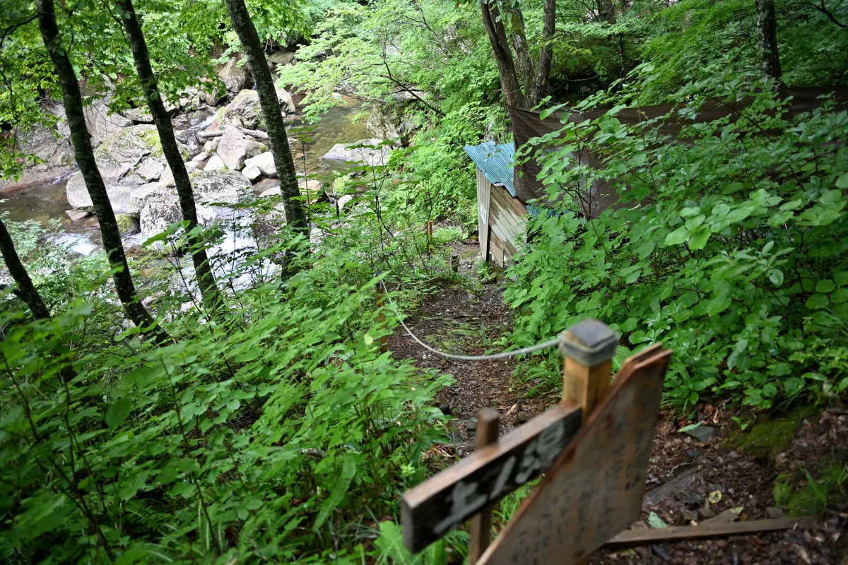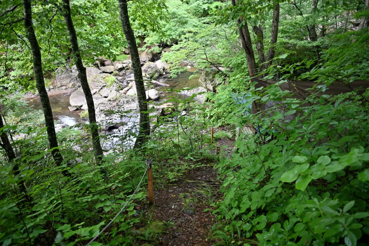 上の駐車場から徒歩10分、谷に降りていく。途中、川の橋を渡り滝の横の小道を通る。